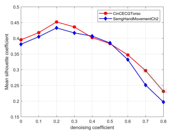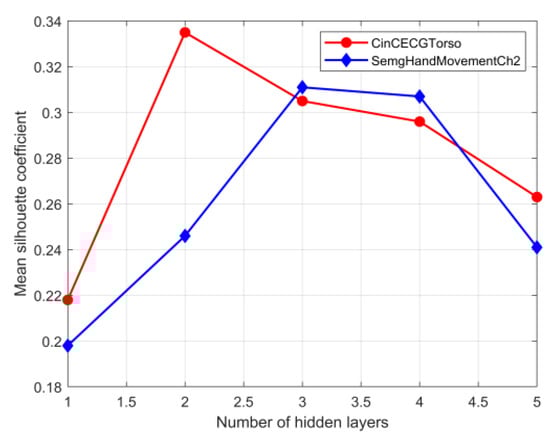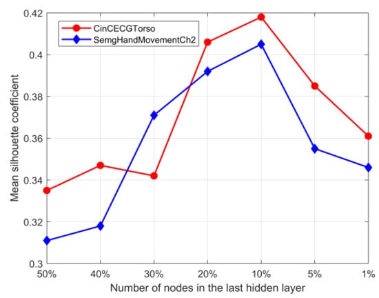 where is the silhouette coefficient for observation , is the mean distance between and all observations of the same class, and is the mean distance between and all observations from the different classes. Silhouette coefficients range between −1 and 1, with 1 indicating dense, well-separated different categories. Therefore, the mean silhouette coefficient for all observations can be used to evaluate the impact of the selection of various key hyperparameters on the performance of feature extraction based on the SDAE network for the two UCR datasets in Table 1. The operation based on grid search [] combined with cross-validation [] can guarantee to find the most accurate set of hyperparameter settings within a specified range, but it required iterating through all possible parameter combinations, which was very time-consuming in the face of large datasets and multiple parameters of interest. Another feasible option was to optimize the hyperparameter set step by step. Considering the characteristics of the SDAE network, the key hyperparameters that are usually concerned are the number of network layers, the number of hidden layer nodes, and the noise level []. As shown in Figure 4, the number of hidden layers of the SDAE network can be firstly determined by the mean silhouette coefficient. Here, in the training process, the adaptive moment estimation optimizer [] was used to search the right learning rate automatically, and the maximum number of training epochs can be controlled based on the early stopping [] technique. Other hyperparameters under the different number of hidden layers were derived through trial-and-error under the control of maximum number of training epochs and minimum reconstruction errors. As shown in Figure 4, when the number of hidden layers of the datasets CinCECGTorso and SemgHandMovementCh2 were set to two and three, respectively, the node number of the last hidden layer that reflected the dimensionality reduction effect can be further analyzed. Here, the hyperparameter configurations determined through trial and error in the previous step were used as the initial settings for the next tuning step and the key hyperparameter determined in the previous step remained constant in the subsequent tuning step. As shown in Figure 5, the number of nodes in the last hidden layer was expressed as a percentage of the original sequence length. After the number of hidden layers and the number of nodes in the last hidden layer were determined in turn, the reasonable value of the denoising coefficient [] in the input layer of the SDAE network can be discussed. Figure 6 gave the relationship between different denoising coefficient and corresponding silhouette coefficient based on the tuning strategy of hyperparameters mentioned above. Hence, based on the hyperparameters determined by the maximum mean silhouette coefficients, the network structures of the SDAE for the two selected datasets used to obtain the dimensionality reduction sequences can be established.