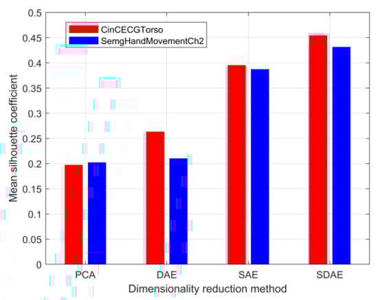Through the above processing, a sequence having a length shorter than that of the original sequence listed in the second column in Table 1 can be obtained. It was straightforward that the effect and rationality of dimensionality reduction needed to be evaluated, indicating that the hyperparameter settings of the SDAE network should be assessed. Ideally, the feature vector generated due to dimensionality reduction should be able to represent the category information of the original sample to the greatest extent, namely, good feature extraction results should make the dimensionality reduction sequences belong to the same category closer, and the distance between the dimensionality reduction sequences belong to different categories farther. Silhouette coefficients [] described as Equation (1) provide a single value measuring both the above two traits.