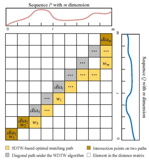 where and represent the i-th point in the optimal matching path and the i-th point in the diagonal of the distance matrix , respectively. The sum of and the distance based on the SDTW () was used as the distance metric of the improved DTW algorithm in Equation (3) and therefore was regarded as the result of the similarity measure: