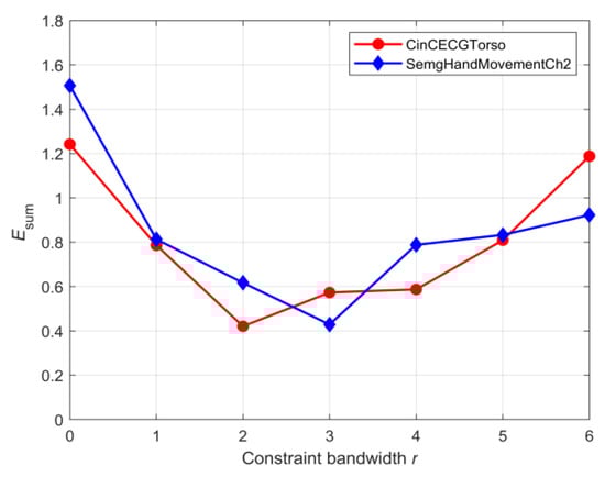 The bandwidth defines the constraint range of the matching path in the distance matrix and suppresses the influence of undesired convergence in the matching path []. Because there was a correlation between the defined warping offset distance and the SDTW algorithm, as well as the SDTW-based distance and the constraint bandwidth , different not only affected the optimal matching path of the SDTW but also led to the change of . The determined the efficacy of the proposed similarity measurement method. It was reported that the 1-NN classifier on labeled data was a feasible way to evaluate the efficacy of the selected distance metric and its classification accuracy directly reflected the effectiveness of the similarity measure []. Moreover, the 1-NN classifier can be used to search for a proper and the idea was to train a labeled dataset with different bandwidth constraints based on two distance metrics , , respectively. Then, two sets of classification error rates and at different through the 1-NN classifier model can be derived. We defined as the sum of and and the constraint bandwidth that minimized was considered to be the appropriate choice for calculating .
