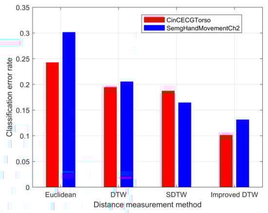 According to the data-processing procedure in the right part of Figure 2, the dataset B listed in Table 1 was further divided into sub-training and sub-test sets after the dimension reduction through the SDAE network. The dataset information used for the supervised learning of the 1-NN classifier was given in Table 2. Here, the sample size of the test set was made significantly larger than that of the training set according to the ratio commonly adopted in the dataset sheet of UCR archives []. First, the best was searched based on the training results of the 1-NN classifier under two distance metrics. Figure 10 showed the variation of the classification error rate of two datasets with respect to after the dimensionality reduction in Table 2, and for datasets of CinCECGTorso and SemgHandMovementCh2 should choose 2 and 3, respectively. Next, the defined under the specified was used as the distance metric of the 1-NN classifier to perform supervised training on the sub-training set. Also, other distance metrics can be applied in the 1-NN classifier to train the sub-training set. Furthermore, the performance evaluation of the similarity measure can be transformed into a comparison of the classification error rate of the 1-NN classifier under different distance measures. The generalization capacities of the 1-NN classifier with different distance metrics were compared in Figure 11 for the sub-test set by the classification error rate. The bar distribution reflected that the distance based on the improved DTW had lower classification error rates for the two sub-test datasets than that of the other distance measure functions, which also meant that the proposed distance metric was more suitable for similarity evaluation.
