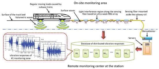 As shown in Figure 12, the regular moving loads caused by subway trains can be regarded as a vibration source. Owing to such excitation, the surface waves propagate omni-directionally on the ground. Because the surface wave couples to the track bed and subway rail, a distributed sensing optic fiber mounted beside the rail along the on-site monitoring area can detect the vibration and can be used to establish the vibration database for each monitoring zone. Figure 13 showed part of the actual engineering scenario in the subway tunnel. The monitoring area of interest covered three underground stations with a total length of nearly three kilometers. According to the spatial resolution of the sensing optic fiber and the on-spot layout of the tunnel structure, more than 500 vibration regions along the track bed can be distinguished based on the interrogated address of the light interference []. Here, the repeatability of the demodulator was revealed in [] and the layout of the monitoring system can refer to []. When a train passed, the real-time vibration response triggered in each monitoring zone was fully transmitted back to the platform monitoring center at a sampling rate of 1 kHz and processed by the demodulator and servers. Therefore, the database of vibration response caused by passing train can be established for each monitoring zone and the location code of the monitoring area can be used as a unique label of each vibration sequence database.