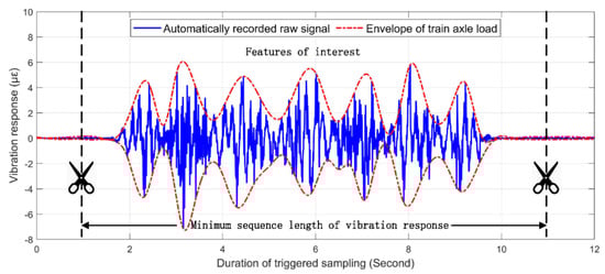 Figure 14 demonstrates the typical vibration responses of a track bed area due to a passing subway train. The triggered vibration responses of each monitoring area automatically recorded due to the passing of the train were basically within 12 s []. The characteristics of the vibration response were mainly composed of pulses with a duration of about 9 s caused by the axle weight. To meet the requirement that the node number of the input samples in the SDAE network must be consistent, the main vibration characteristics caused by the action of the train axle in each sample were retained. The sampling points at both ends of the vibration response were then truncated to match the minimum sequence length of the vibration response. Finally, min-max normalization [] was used to normalize all the vibration amplitudes to the range of 0~1, which can boost a better learning efficiency for the SDAE network.