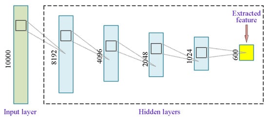 As shown in the left part of Figure 2, feature extraction was primarily based on unsupervised training to shorten the sequence length in the second column of Table 1. Here, labels were just a supplement to fine-tune in the second training stage of the SDAE network, which was generally stacked by multiple three-layer DAE models. Figure 3 shows the structure of a typical SDAE network, which was formed by stacking three sub-DAE networks. Because the noise was actively added to the input data, hidden layers in such networks can retain more robust sample features during the learning process []. Here, greedy layer-wise training [] that can boost the network learning efficiency was a preferred solution to conduct the pre-training process. In the first stage of feature extraction, the initial features of the input sample can be forcibly extracted through the unsupervised learning network. To obtain a better feature extraction effect, labels of the input sample were used to establish a classification output layer to perform a supervised training. Thereafter, a feature extraction model based on the SDAE network can be obtained through training the dataset A in Table 1. When a new sample dataset B was fed into the trained model, the feature representation of the last hidden layer can be regarded as reduced-dimensional features of the original input.