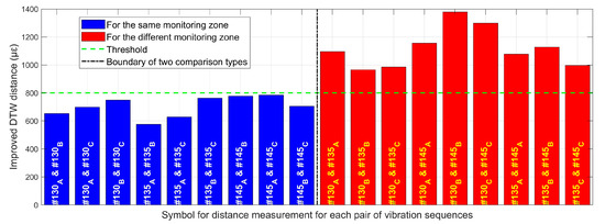 Figure 16 shows similarity measures between two vibration sequences related to the monitoring zone and the passing train. The left side of the dotted boundary in the bar graph displays the similarities between each pair of vibration responses of the same monitoring zone under different passing trains, while the right side of the boundary shows the similarities of different monitoring areas passed by the same train. Here, the subscripts A, B, and C of the monitoring area numbers in each bar column indicate the different passing trains, and two related monitoring area labels for measuring distance are connected by the symbol ‘&’. Obviously, the threshold of the two comparison types represented by the distance derived from the improved DTW algorithm can be identified, and it was about 800 με. The distance unit here depended on the vibration signal denoted by the strain-induced phase variation between two ultra-weak FBGs []. Because the results in the left part of Figure 16 are all below the threshold, it is quantitatively revealed that the similarity of the vibration response at the same physical location in the underground structure is significantly higher than the measurement results between different locations. Moreover, by using the mean distance based on the improved DTW algorithm, the similarities for monitoring zones #130, #135 and #145 can be determined as 700 με, 656 με and 756 με, respectively. The quantitative outcomes based on distance measure not only indicated that the similarity of the structural vibration changed with the location of the underground structure but also revealed that the proposed method can effectively quantify and distinguish such similarity difference. Hence, the condition change of the surrounding structure and environment can be tracked by similarities of structural vibration detected by distributed ultra-weak FBG array.