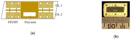 A 36YX-LiTaO3 single crystal was selected as the substrate. Floating electrode unidirectional transducers (FEUDTs) were fabricated on the crystal surface for generating and receiving the SH-SAW [14,20]. The FEUDT was used for improving the insertion loss and phase distortion. The SH-SAW sensor consisted of a dual delay-line transversal type SH-SAW (see Figure 1). The center frequency is 51.5 MHz and the wavelength (λ) was 80 μm. The electrode materials were titanium (10 nm) and gold (200 nm). The aperture of the FEUDT was 2 mm, the number of pairs was 32, and the electrode finger width and the space between the fingers was λ/12. The center-to-center distance between FEUDTs was 11 mm. The SH-SAW propagating surface of the channel (Ch.) 1 was metallized and electrically shorted by the titanium and gold films to detect only mechanical perturbation. The thicknesses of those materials are the same as those of the FEUDT. As the SH-SAW propagating surface of the Ch.2 has the free area and a direct liquid contact with the crystal surface, the SH-SAW on the surface is influenced by mechanical and electrical perturbations. The differential signal between the Ch.1 and Ch.2 was detected for obtaining the electrical properties.