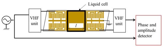 The experimental system used in this study is shown in Figure 2. A sinusoidal signal of 51.5 MHz from a signal generator (MG3601A, Anritsu, Japan) was divided into two signals. One of them was used for the reference signal and the other was connected to Ch.1 or Ch.2. The channels were selected using a very high frequency (VHF) switching unit (3488A, Keysight, Mansfield, TX, USA). A vector voltmeter (8508A, Keysight, Mansfield, TX, USA) was used for detecting the phase difference between the SAW sensor output signal and the reference signal, and the amplitudes of two signals. In the measurements, first, the reference liquid was injected into a liquid cell fabricated on the propagation surfaces for the calibration. Subsequently, the reference liquid was replaced by sample liquids and the changes of phase and amplitude between the reference and sample liquids were obtained for each channel. The differential signal between the Ch.1 and Ch.2 was calculated from these data using a personal computer (PC).