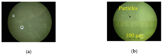 In this study, two engine oils were prepared: new engine oil (Yamaha 4 stroke motor oil, SAE 10W-40) and used engine oil. The used engine oil was extracted from a scooter (JBH-SA39J, Yamaha Motor Co., Ltd., Iwata, Japan), that had travelled 6000 km. Photographs of the engine oils are shown in Figure 12 in Reference [16]. Observation results of the engine oils with a microscope are shown in Figure 3. As particles exist in the used engine oil, it is important to discuss their influence of the particles. Although the kinds of particles have not been analyzed, iron (Sigma-Aldrich Japan, Tokyo, Japan, ϕ5–9 μm) and carbon (Fuji Film Wako Pure Chemical Co., Osaka, Japan, ϕ45 μm) powders were used in this study. The reference liquids used in this study were olive oil (Fuji Film Wako Pure Chemical Co., Osaka, Japan) or the new engine oil. The relative permittivity, conductivity, and viscosity of the olive oil were 3.1 and 0.0 S/m, and 90.0 mPas, respectively. The conductivity was measured using a conventional conductivity meter. The relative permittivity and conductivity of the olive oil was used for calculating the electromechanical coupling factor in Equations (A5) and (A6). In this study, three types of the measurements were carried out: 1) influence of the particles of iron and carbon, 2) influence of the heating, and 3) influence of the water contained in the oil. The particles were observed in the used engine oil, the influences of particles were experimentally discussed. The operating temperature in an engine is high, so the influence of the heating must be discussed. When the temperature of an engine decreases, moisture is contained in the engine oil owing to dew condensation. In this study, distilled water was mixed with the new engine oil to confirm the influence of water in the oil.