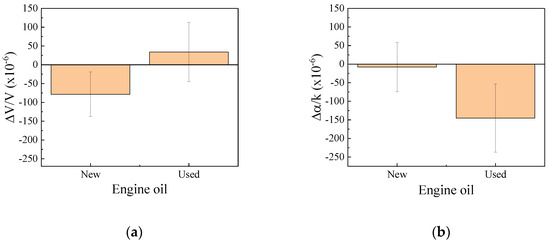 Measured results of new and used engine oils obtained from Ch.1. The reference liquid was the olive oil. (a) Velocity change and (b) attenuation change.
