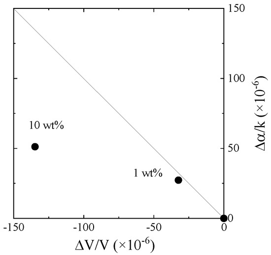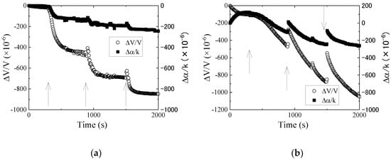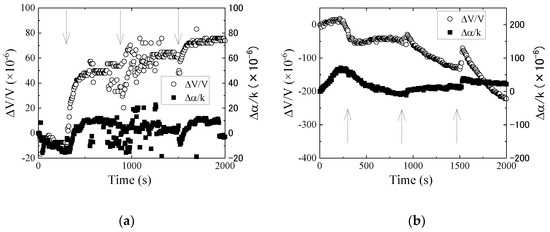 The iron and carbon particles were injected into the new engine oil. The results for the iron and carbon powders obtained from Ch.1 are shown in Figure 5a,b, respectively. The arrows in the figure indicate the addition time of the powders weighting 0.5 mg. In Figure 5a, the velocity change increases, while the attenuation change increases initially and then becomes constant. As depicted from Equations (A3) and (A4) for mass loading, the velocity change decreases, and the attenuation change is zero. The obtained results do not agree with the perturbation theory. We assumed that the increase of the attenuation change (at the first injection of the iron powders) was due to the viscosity change. The penetration depth of the SH-vibration depends on the liquid density and viscosity, and increases with an increase in viscosity [13]. As the viscosity of the engine oil was almost the same as the olive oil, the viscous penetration depth was approximately 700 nm. The powder diameter was larger than the depth, and a part of the particle existed in the penetration depth. As the SH-SAW was influenced by the change in viscosity, the attenuation change increased. The value of the attenuation change was subtracted from the velocity change to eliminate the influence of viscosity on the velocity change. However, the velocity change increased. Equations (A3) and (A4) were derived when a thin and uniform layer was loaded on the SH-SAW propagation surface. In this case, the oil exists between the particles, and the influence of oil was not considered. The increase of the velocity change was explained by considering the effective density, which was determined from the liquid and iron densities [16]. For Figure 5b, the velocity change decreases, and the attenuation change slightly increases with increasing the amount of the carbon powders. As the density of the carbon is smaller than it of the iron, the sedimentation rate of the carbon powder is less than that of the iron powder. Therefore, the velocity change did not saturate at the second and third powder injections.