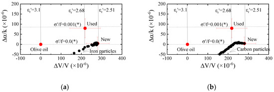 Evaluation of the electrical property changes of (a) iron and (b) carbon powders in new engine oil using the relative permittivity–conductivity chart. The arrow shows the direction of time. The results of olive oil and new and used engine oils are also plotted in the figure. (*: 1 × 10−8 (S/m)/Hz).