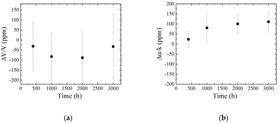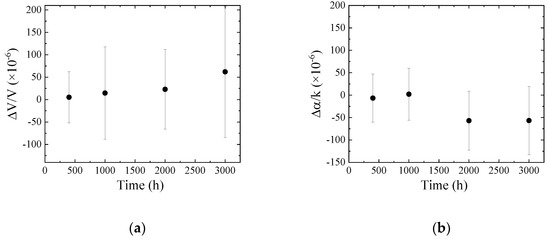The operating temperature of the engine is high, hence, engine oil is influenced by temperature. The new engine oil was injected into a vessel and heated from 400 to 3000 h at 100 °C. To observe the influence of oxidization, the lids of the vessels were not closed. A photograph of the samples after heating is shown in Figure 8. The color depends on the heated time and changes due to the oxidization. The color after 3000 h of heating is similar to the used engine oil (see Reference [16] Figure 12). The measured results obtained from Ch.1 are shown in Figure 9. The reference liquid was the new engine oil. The mechanical properties of the liquid are influenced by the heating. When the velocity and attenuation changes of the reference liquid is assumed to be zero, the following relation is derived from Equations (A1) and (A2).