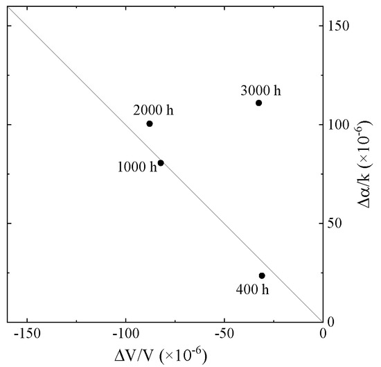 The average values in Figure 9 were plotted in Figure 10. As the results of 400 and 1000 h heated are on the line, those liquids are categorized as Newtonian fluid. Whereas, the sample liquids with 2000 and 3000 h heating are the non-Newtonian fluid. Compared to our previous results, those liquids can be regarded as viscoelastic fluid [14]. Therefore, the heating of the engine oil can be used to perform evaluation based on the mechanical perturbation. However, the tendencies of the measured results do not agree with Figure 4. The observed difference between the new and used engine oils in Figure 4 could not be explained by the heating effect.