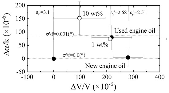 Evaluation of the SH-SAW sensor responses in Figure 13 using the relative permittivity–conductivity chart. The results of the olive oil and new and used engine oils are also plotted in the figure. (*: 1 × 10−8 (S/m)/Hz)