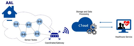 Ambient assisted living (AAL) is built on top of those smart home services and require the deployment of better monitoring technologies and assistive tools. AAL systems are specially designed to support the elderly and people affected by chronical diseases in their daily routine [4]. The main goal of AAL systems is to improve the life quality of the elderly and to extend the time they can live independently. These systems are expressed by an ecosystem of wearable and non-wearable medical sensors, wireless sensor and actuator networks (WSANs) and software applications that, when interconnected, provide a complete overview of the patient’s health status for specific environmental conditions, as well as a provision of the required healthcare services [5]. That is, an AAL system is based on the architecture of a healthcare focused IoT system. Figure 1 presents a general overview of such kind of systems, which are composed of environmental quality sensor nodes, actuator nodes and wearable devices. The information from the sensor network is sent to a coordinator node/gateway and then to cloud centers, where data is processed by data analysis algorithms.