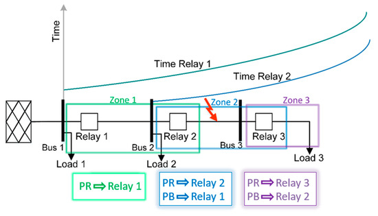 Electrical distribution networks typically consist of a secondary substation and a main feeder with lateral branches. In Figure 1, a radial distribution network, consisting of a secondary substation, a main feeder, three bus bars, and three loads, is used as an example to illustrate these principles. The placement of the three protective devices, namely, Relay 1, Relay 2, and Relay 3, delimits the three zones of protection; Zone 3 is protected by Relay 3 as its PR and by Relay 2 as its BR. Similarly, Relay 2 and Relay 1 are the PR and the BR, respectively, for Zone 2. Finally, Zone 1 has only Relay 1 which it is the PR. If a fault occurs in Zone 3 but the local PR of that zone (Relay 3) and the BR (Relay 2) fail to operate, then Relay 1 should operate to isolate the fault that occurred downstream of its protection zone. Figure 1 illustrates the typical relays’ operation curves and coordination time between their respective PRs and BRs, for a fault in Zone 2.