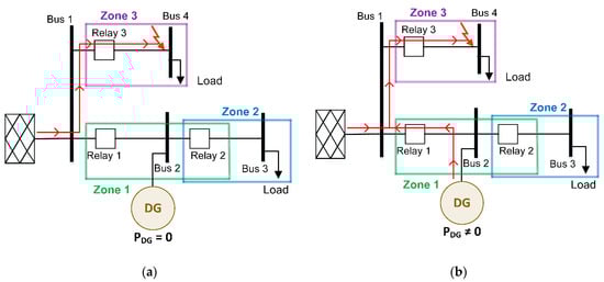 DG impact on fault current—sympathetic tripping: (a) without DG generation and (b) with large-scale DG generation.