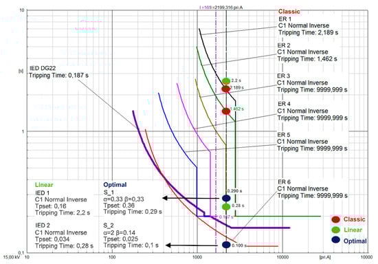 As previously mentioned, classical analog electromechanical relays have proven to be inefficient when applied in networks with DGs [41]. To solve the problems of classical coordination, the authors in [42] employed IEDs with linear optimization techniques to adapt the protections settings using a centralized scheme. In this case, a constant ratio / was considered, and a single variable in the optimization process was optimized (). However, the results in [43] obtained from the linear optimization process using a single variable were not suitable because they do not consider all the network operating conditions (Figure 4a). To overcome these limitations, the protection coordination problem has been solved using IEDs with nonlinear optimization algorithms, in which and the ratio / were the decision variables [43]. A limitation of this approach is that it uses only the predefined time–current characteristic curves included in the IEC standard [23].