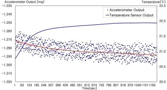In Figure 2, the left and right axes represent the output and temperature, respectively, of the accelerometer. The small dots are the experimental results of the accelerometer measurements and the red solid line starting from −1.272 is their average. Consequently, it is shown that the measurements converge around −1.282. Most accelerometers exhibit dynamics similar to that above, even though the initial amplitude and the convergence behaviors are different. Moreover, the accelerometer output shown in Figure 2 is of measurements compensated using a temperature function that is practical for use in self-alignment. The bias error in the temperature stabilizing state can be modeled as follows.