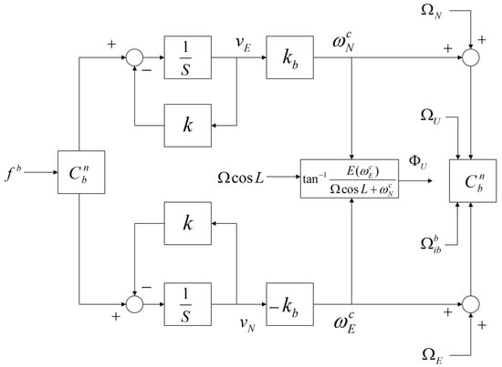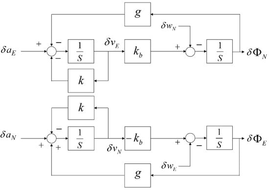 Error model of the self-alignment loop. While E(N)-axis velocity error induces N(E)-axis attitude error (), vertical attitude is not related to horizontal velocity errors.
