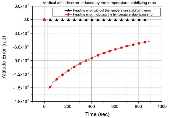 Heading errors depending on the temperature stabilizing error. Temperature stabilizing error induces exponentially decreasing heading error, which is greater than the horizontal attitude error in Figure 5.