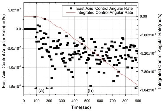 Control angular rate and its integration during temperature stabilization. The control rate changes exponentially in (a) region because of the temperature stabilizing error. The control rate is stabilized in (b) region and its integrated curve is almost linear. The control rate is overall scattered by gyro random walks, and its integrated curve has a minor deviation in both (a) and (b) region.