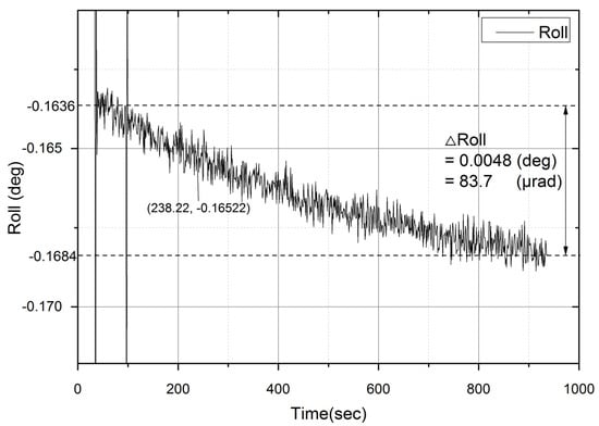 The drift of a roll angle during a self-alignment experiment. Even though the Inertial Navigation System (INS) was stationary, the roll angle gradually decreased, and the amount of the decrement became 0.0048° at 900 sec. This roll angle variation is caused by accelerometer temperature stabilizing error.