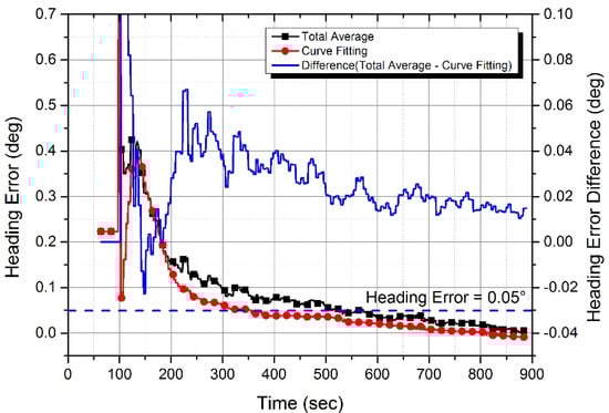 In the experiment, while the self-alignment was performed 38 times sequentially, temperature stabilizing occurred. This means the temperature stabilizing error reveals itself most significantly in the first run. The first alignment result is displayed in Figure 9. The heading error of the curve fitting method (red line, circle symbol) converges to almost 0°, which is smooth compared to that of the total average method (black line, square symbol). The black line has local fluctuation, which is caused by a gyro random walk. The longer the total average time is, the less the fluctuation becomes.