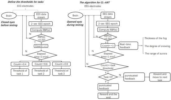 For CL-ART, EEG data were collected through an eight-channel wireless EEG recording device (StarStim 8™, Neuroelectrics Inc, Barcelona, Spain), which uses a high-resolution, high-speed analog-to-digital converter (24 bit at 500 sampling rate), and supports Bluetooth connection. The conventional wet electrodes were used and placed at O1, Oz, and O2 regions, which are proven locations that are highly correlated with the user’s vigilance level in the context of a real-time and real-world scenario [38,39]. The ground and reference electrodes were connected together and placed on the right earlobe using an ear clip. An external electrode was placed below the lower eyelid to record eye movements. The collected EEG data were firstly filtered using a 4–30-Hz bandpass filter and averaged across O1, Oz, and O2 channels. Then, two types of EEG-based feedback (as shown in Figure 1) were provided to participants: (1) real-time feedback, which was based on the values of relative α band power (RBP(α), see Equation (A1) in Appendix A) calculated every 2 s, indicating the dynamics of within-task vigilance level, and (2) punctuated feedback, which was based on the total counts of the values of 2-s RBP(α) being larger than 0.35 (35%) every 1 min, indicating the vigilance level between tasks. The specific thresholds between tasks were weighted values of the highest counts of RBP(α) > 0.35, which were determined using min-by-min observations during the initial 3-min EEG baseline testing session. The weights were 0.4, 0.6, and 0.8 for tasks 1, 2 and 3 respectively. Here, the values of weights and the value of 0.35 were based on feedback from our pilot testing, in which the principle of selecting these values was that the participants should not consider it too easy or too difficult. The lab streaming layer protocol [40] was used to synchronize the vigilance level and the Unreal Engine-based virtual natural scenes.