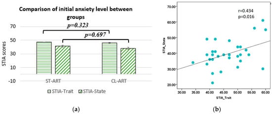 (a) One-way ANOVA analysis of state and trait anxiety State-Trait Anxiety Inventory questionnaire (STAI) scores between ST-ART and CL-ART groups; (b) scatter plots for state and trait anxiety STAI scores.