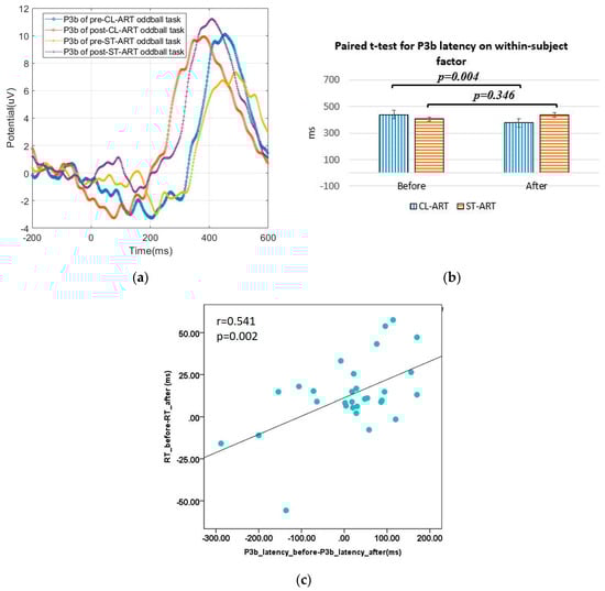 For RT, we found a significant difference in P3b latency (F(1, 29) = 6.581, p = 0.016) between groups. The paired t-test of P3b latency before and after CL-ART intervention (t(14) = 3.481, p = 0.004) further shows that participants responded, on average, 62 ms faster in the post-CL-ART oddball task (M = 377.733 ± 17.116 ms) than in the pre-CL-ART condition (M = 439.867 ± 8.964 ms), indicating the neural evidence of enhanced attention level. This trend is clearly shown in Figure 3a and b by comparing the grand average of P3b between ST-ART and CL-ART groups. Furthermore, as shown in Figure 3c, we found a significant correlation between RT difference and P3b difference (p = 0.002, r = 0.541), indicating the highly correlated behavioral and neural evidence.