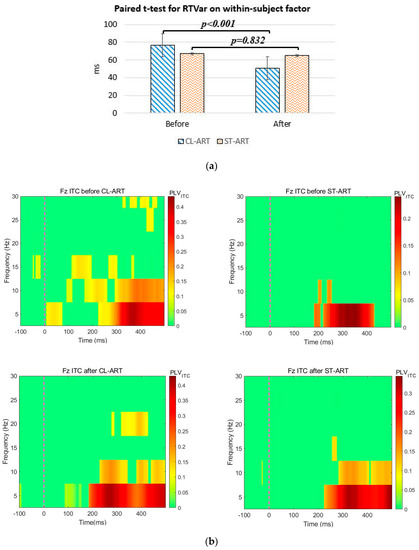 (a) Paired t-test and subject means for RTVar; (b) the group grand average for ITC captured before and after the two kinds of ART interventions; as can be seen here, the highest phase-locking value (PLV; deep red) in the “after CL-ART” condition occurred in the bin of 200–300 ms, which was clearly faster than that in the bin of 300–400 ms in other conditions; (c) scatter plots for RTVar difference and ITC difference.