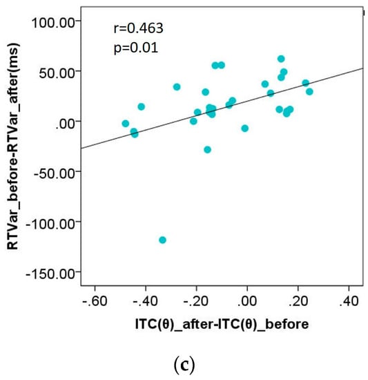 We found a significant difference in RTVar data between groups (F(1, 29) = 4.256, p = 0.048), with M = 2.278 ± 10.532 ms for ST-ART and M = 25.932 ± 4.533 ms for CL-ART. The paired t-test (t(14) = 5.721, p < 0.001) further reveals that participants responded with less variability in RT in the post-CL-ART oddball task (M = 50.929 ± 3.940 ms) if compared to the pre-CL-ART condition (M = 76.862 ± 4.335 ms), as shown in Figure 4a. Moreover, we observed that there was a most prominent difference in averaged values at 300–400 ms post-stimulus ITC(θ) between groups (F(1, 29) = 14.215, p = 0.001). Such a group difference in ITC(θ), as shown in Figure 4b, was found by comparing the 100-ms bins one by one in our time window of interest (see Table 3). These behavioral and neural findings indicate that CL-ART may be indeed superior to ST-ART for improving attentional engagement. The highly correlated RTVar difference and ITC(θ) difference (p = 0.01, r = 0.463; see Figure 4c) further reveals the robustness of these findings.