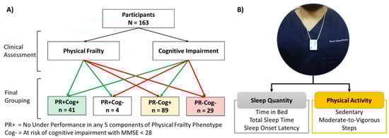 While prior studies showed the ability of wearable sensors to identify age-related “motoric cognitive risk syndrome” [34] (decline in both cognitive and motor performance), they did not explore whether wearable sensors can distinguish between the four frailty groups, especially the cognitive frailty group. In this study, we aim to evaluate the ability of sensor-derived parameters to distinguish older adults at risk for cognitive frailty syndrome from those who are not at risk. We hypothesize that indicators of mobility performance (e.g., daily step counts, activity behavior, and commutative postures such as sitting, standing, and lying) and sleep quantity (e.g., total sleep time, sleep onset latency, etc.), measured remotely using a pendant sensor, could identify those who suffer from cognitive frailty syndrome.