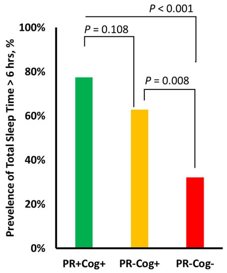The prevalence of cases with total sleep time exceeding 6 h per night in each of the three groups: physically robust and high cognitive function (PR+Cog+), signs of physical frailty with high cognitive function (PR-Cog+), and signs of physical frailty with risk of cognitive impairment (PR-Cog-), defined as cognitive frailty in this study. Lowest significant sleep deprivation was observed in the cognitive frailty group.