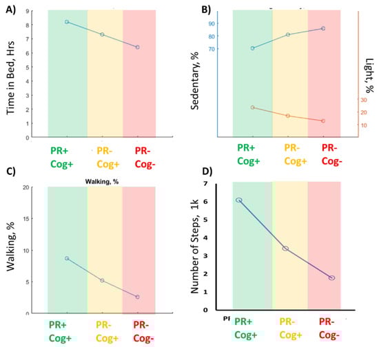 The top 4 sensor-derived parameters to identify the cognitive frailty group (PR-Cog-) from other groups. (A) the time in bed declined from robust group (PR+Cog+) to cognitive frailty group. (B) The percentage of sedentary duration increased while light activity reduced from Robust to cognitive frailty group. (C) the percentage of walking duration declined from Robust group to cognitive frailty group. (D) The number of steps reduced from robust group to cognitive frailty group. .