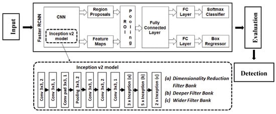 Despite using radiometric corrections as histogram equalization and histogram matching techniques, the variation of light exposure turns target detection into a challenge facing deformation and oscillation monitoring by photogrammetry, especially at outdoors applications like structural monitoring, as presented in the case of Humber and Tamar bridges monitoring using close-range photogrammetry, [5]. On the other hand, the rapid development in neural networks techniques and deployment allows object detection in various light exposure conditions, based on a deep learning process that trains the network to detect targets in such situations. Faster R-CNN is a developed algorithm that is based on the approach of region-based convolutional networks, while a discrete network that is used to forecast the region proposals [26]. Faster R-CNN with inception V2 model presented in Figure 3 is a fast and efficient algorithm that constructs an inception v2 network from inputs to the given final endpoint up to the layer inception (5b) as described in [27]. This network has been implemented to detect two classes, which are the target and a predefined marked tracking point (named Track-point).