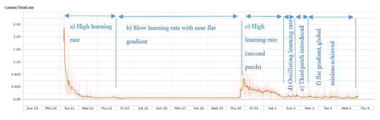 Tensor Flow application programming interface (API) [31] has been used to train the network, applying a transfer learning form model pre-trained [32] on the Common objects in context (COCO) dataset [33]. The training was performed over three phases to check the training performance. In the first phase, the network was trained by about 300 labeled images for the learning dataset and 40 labeled images for the testing dataset. Then learning is applied to the second and third learning stages, using about 150 new images per phase for the learning dataset and 40 images for the testing dataset. The network training was performed based on CPU processor computations due to the usage of relatively large images in the training dataset (about 600 × 1000 pixels), resulting in GPU memory overflow even when reducing training patches to one image. As a result, the training process consumed about eight days for training for the first phase, and four days per each successive phase. The loss function was used to indicate network training, as presented in Figure 5. Images with the resolution of 8 MP, 12 MP, 16 MP, and 1920 × 1080 pixels were used as input to maintain the grade of detail in the images compared to images obtained by monitoring.