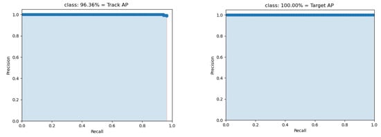 Network evaluation is performed applying mean average precision (mAP) open source code [34], by using 138 images, including 139 Targets and 138 Track-points. Average precision (AP), mean average precision (mAP), recall, and intersection over union (IoU) [35,36] are used for the network’s performance evaluation, where IoU refers to the degree of coincidence between the detected area and the ground truth area as: