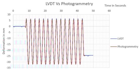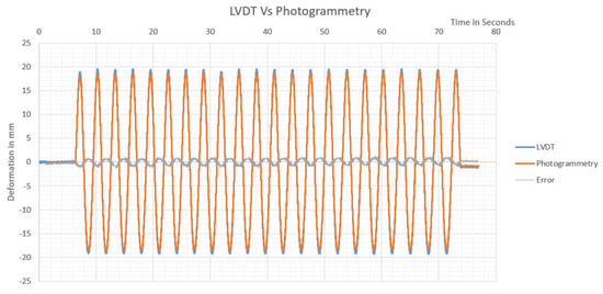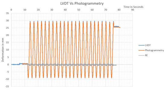 The maximum difference between observations measured using LVDTs system and photogrammetry was found to be 1.251 mm, while the minimum difference was −1.241 mm, resulting in a maximum RE of ±1.251 mm and RMSE of ±0.563 mm, as shown in Figure 14.