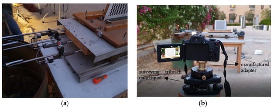 As presented in Figure 11b, the camera was mounted on a surveying tripod used a specially manufactured adapter that allowed using surveying tribrach, in order to ensure stability at a windy outdoor condition. Three LVDT’s props were glued to the table, as shown in Figure 11a, to avoid LVDT spring, late response relative to the table oscillation speed. The readings of the three LVDTs are measured at each time instant, with a logging rate of 10 ms (100 Hz), and the average and standard deviation of readings are calculated, the reading with error more than three times the standard deviation is neglected from the average readings of LVDTs. For the oscillation monitoring using terrestrial photogrammetry, a video of 60 fps was used with a resolution of 1920 × 1080, while the captured video metadata showed that the video had a framerate of 59.94 fps which is used later in the analysis.