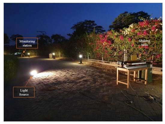 Monitoring from the second station was conducted at night using a direct artificial lighting source to examine the ability of the proposed monitoring system in different light exposures, as shown in Figure 13. Moreover, the station is set 28 m apart from target to simulate different required site conditions for monitoring. The field of view at adjusted camera focus was found to be 807.715 mm and 451.334 mm in the x and y directions, respectively. Accordingly, for monitoring using a video of 1920 × 1080 pixels’ accuracy of 0.421 and 0.418 mm is expected in the x and y directions, respectively.