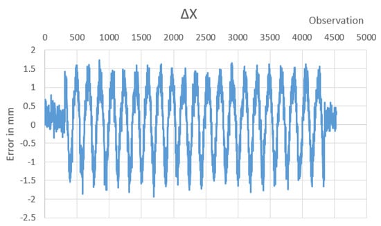 The maximum difference between observations measured using photogrammetry applying Harris corner detector and applying Faster R-CNN network was found to be 1.7255 mm, and the minimum observed difference was –1.93743 mm, resulting in maximum RE of ±1.93743 mm, while the measured 4526 observations have RMSE of ±0.868 mm, as shown in Figure 15.