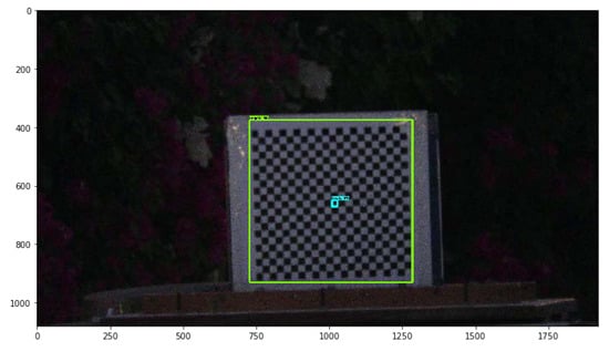 Detecting target points using Harris corner detector proved excellent performance, as shown in previous experiments that were conducted in different environments with a variety of light exposure conditions. However, real-life monitoring conditions can be more challenging, and that is what raised the need for an AI algorithm to help in such scenarios. Faster-R-CNN successfully detected both classes in cases of bright sun and shadow partially covering the target, as shown in Figure A1. To check the reliability of AI for target detection at low light exposure conditions, the test setup presented in Figure 13 was used, while the light source was switched off before the monitoring process. Harris corner detector algorithm could not detect the targets in 3056 out of a monitored 3782 frames. The first successfully detected frame was the fifth frame. On the other hand, the AI aided algorithm detected Target and Track-points in all 3782 monitored frames, as shown in Figure 16.