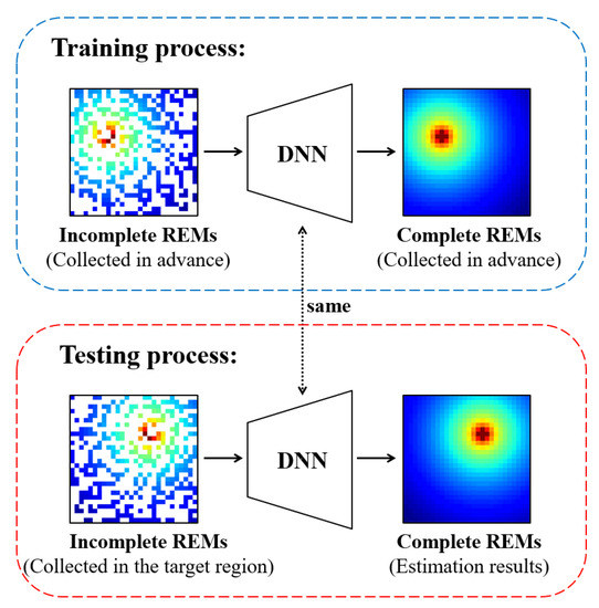 As a significant method of the artificial intelligence (AI), deep learning technology has irreplaceable advantages in the radio environment maps estimation task [16]. By exploiting the latent propagation features of the wireless environment, we can get the prior knowledge on the basis of the deep neural network (DNN) through supervised training (Figure 2), which makes the radio environment maps estimation results more intelligent and precise. However, the studies on deep learning-based REMs estimation algorithms are just in primary stage and deserve more research.