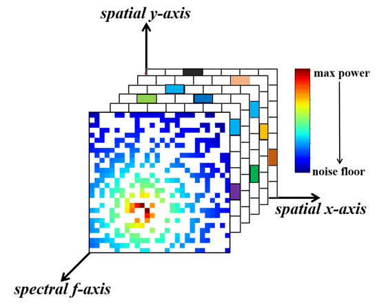 In the color mapping process, we divide the target region into grids and assume that there is at most one user (one PU or one SU) in each grid. Then we normalize the secondary users’ receiving power spectrum, and map the power components of different frequencies to different colors uniformly, as shown in Figure 3. The white squares in the REMs are the grids where there are no secondary users. Our goal is to estimate the power values at the white squares.