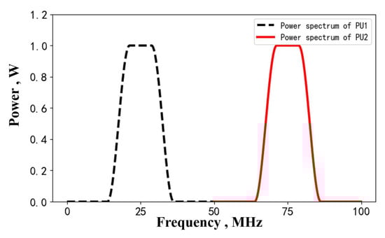 We divide the testing area T into grids. Regarding the testing data set, we assume , and for the target area T. We assume that two transmitting primary users are located at grids (20,18) and (40,35), under the AWGN with known variance . The receiving secondary users are uniformly distributed in T. The number of SUs is about 15% of all grids. The PUs are transmitting random signals. By sampling the PUs’ signals, their power spectrum can be obtained on the basis of the periodogram algorithm. In our simulation settings, the power spectrums of PU1 and PU2 are directly set, as shown in Figure 8, which center at 25 MHz and 75 MHz.