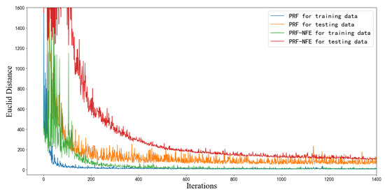 As shown in Figure 9, the convergence performance of PRF (blue line) is better than that of PRF-NFE (green line) under the same number of iterations. The above convergence results are caused by the fact that the feature enhancing module can intelligently emphasize the important features and extract more information from the incomplete training data. The PRF algorithm has a stronger feature extracting ability than the PRF-NFE algorithm because of the feature enhancing module, which promotes the convergence during the training process.