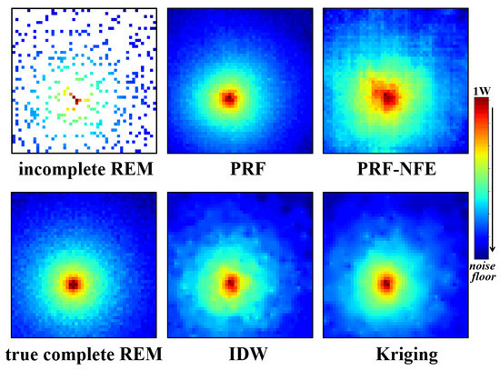 Compared with the true, complete radio environment maps, the PRF method achieves better estimation results than the IDW and Kriging method from the direct visual display, especially the estimated area near the source of radiations.