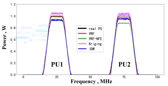 Regarding the performance of the estimated power spectrum, we compare the PRF reconstruction results with the true primary users’ power spectrum in Figure 12. The testing performance demonstrates the estimation ability of the PRF for the unused bands. Figure 12 shows that the PRF has a better reconstruction performance than PRF-NFE, Kriging and IDW interpolation.
